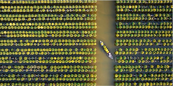 Tuấn says, “I love taking photos of landscapes and traditional craft villages in my country, especially the golden chrysanthemums growing village in Sadec, Dong Thap, Vietnam because of the way farmers have relied on nature and terrain to choose the right way to grow flowers. Sadec was formed on the tributaries of the Mekong River (one side is the Tien River, the other side is the Sa Dec River). These two tributaries of the river deposit alluvium, have good humidity but are also often flooded and have high tides, perhaps that is why farmers here build high trellises to grow flowers on to avoid flooding, and take advantage of the water source below to water the plants and limit pests as well as use boats to transport plants during harvest. In the last lunar month of the year, it will be the harvest season.