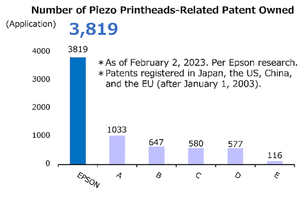 Piezo printheads are a core device in the printing sector. Epson own more patents related to these printheads than anyone else in the industry1. This IP differentiates Epson from its competitors and is being actively developed or used in new inkjet printer products.