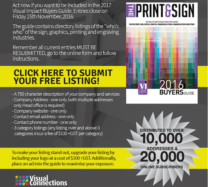 Do not miss your opportunity for a free company listing in the 2017 Visual Impact Buyers Guide.
